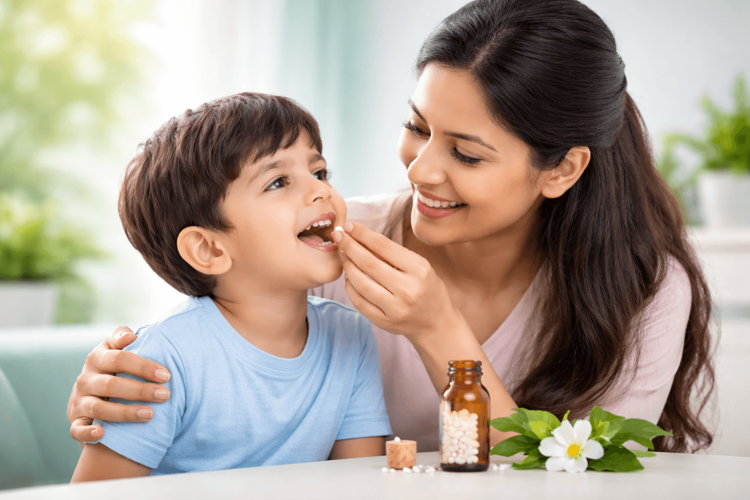 बच्चों के लिए होम्योपैथी उपाय – मां द्वारा बच्चे को सुरक्षित और कोमल होम्योपैथिक दवा देते हुए, जो बच्चों के लिए प्राकृतिक और भरोसेमंद उपचार का प्रतीक है।